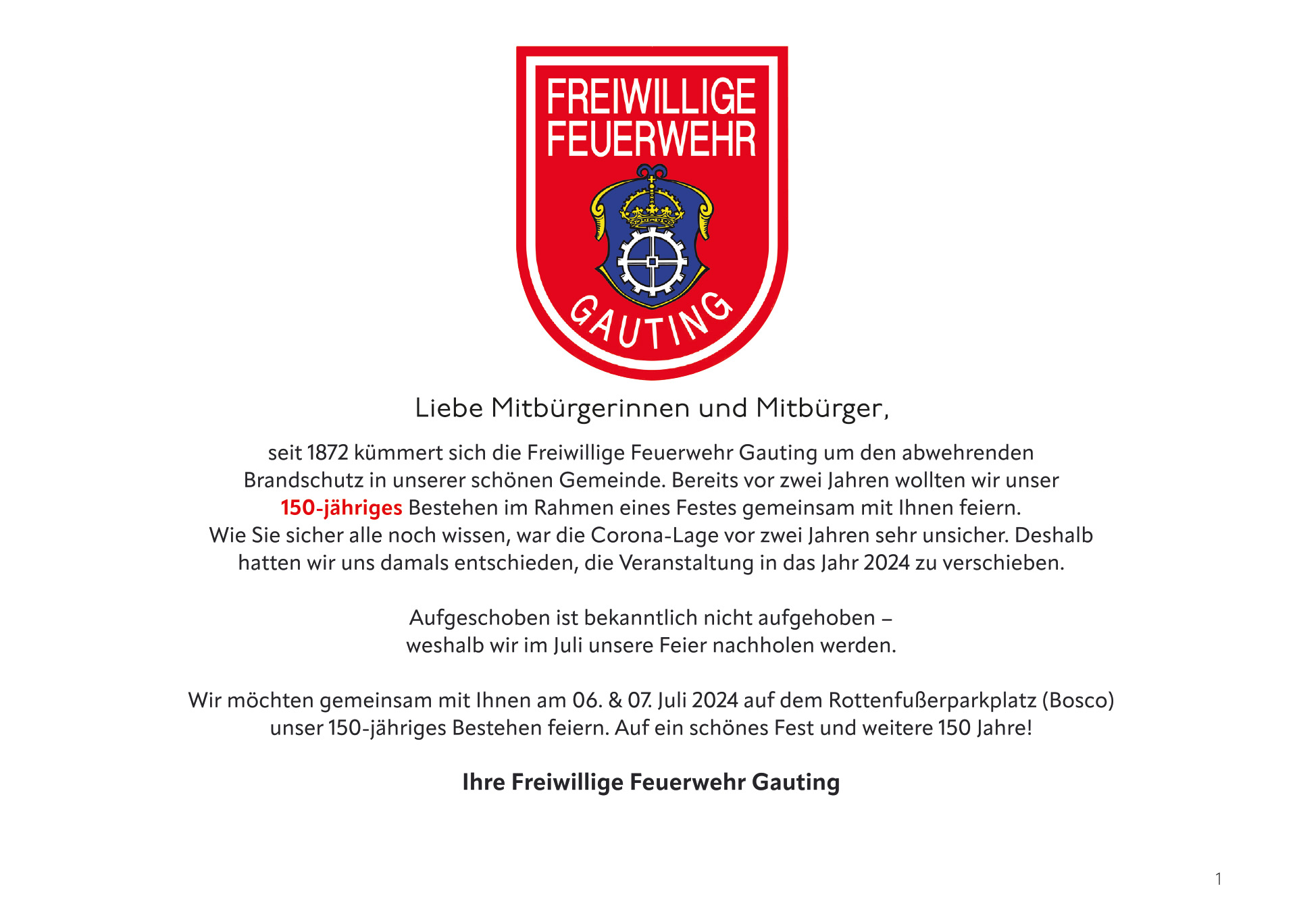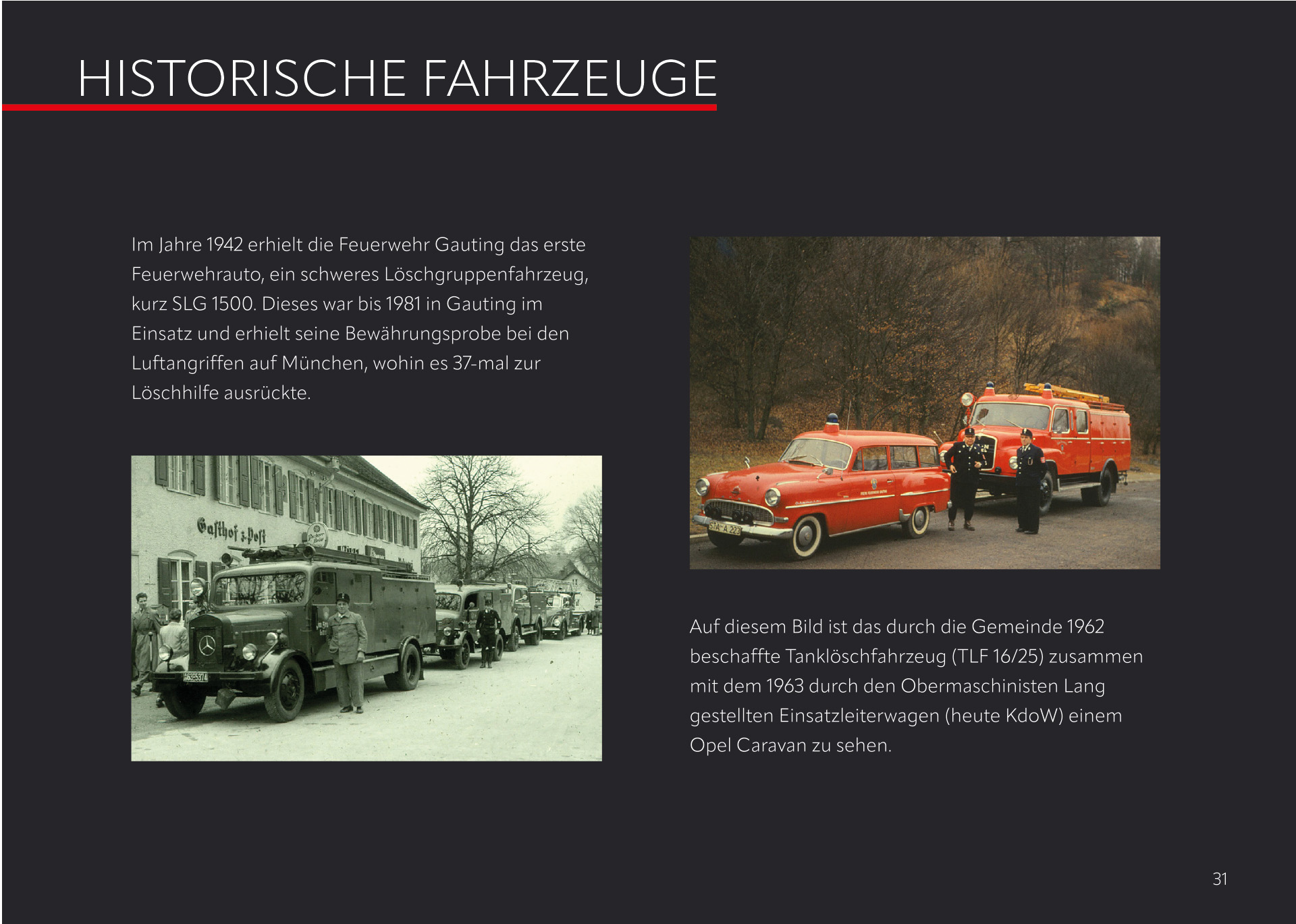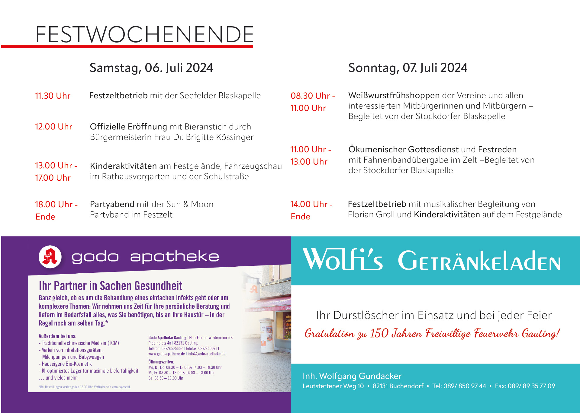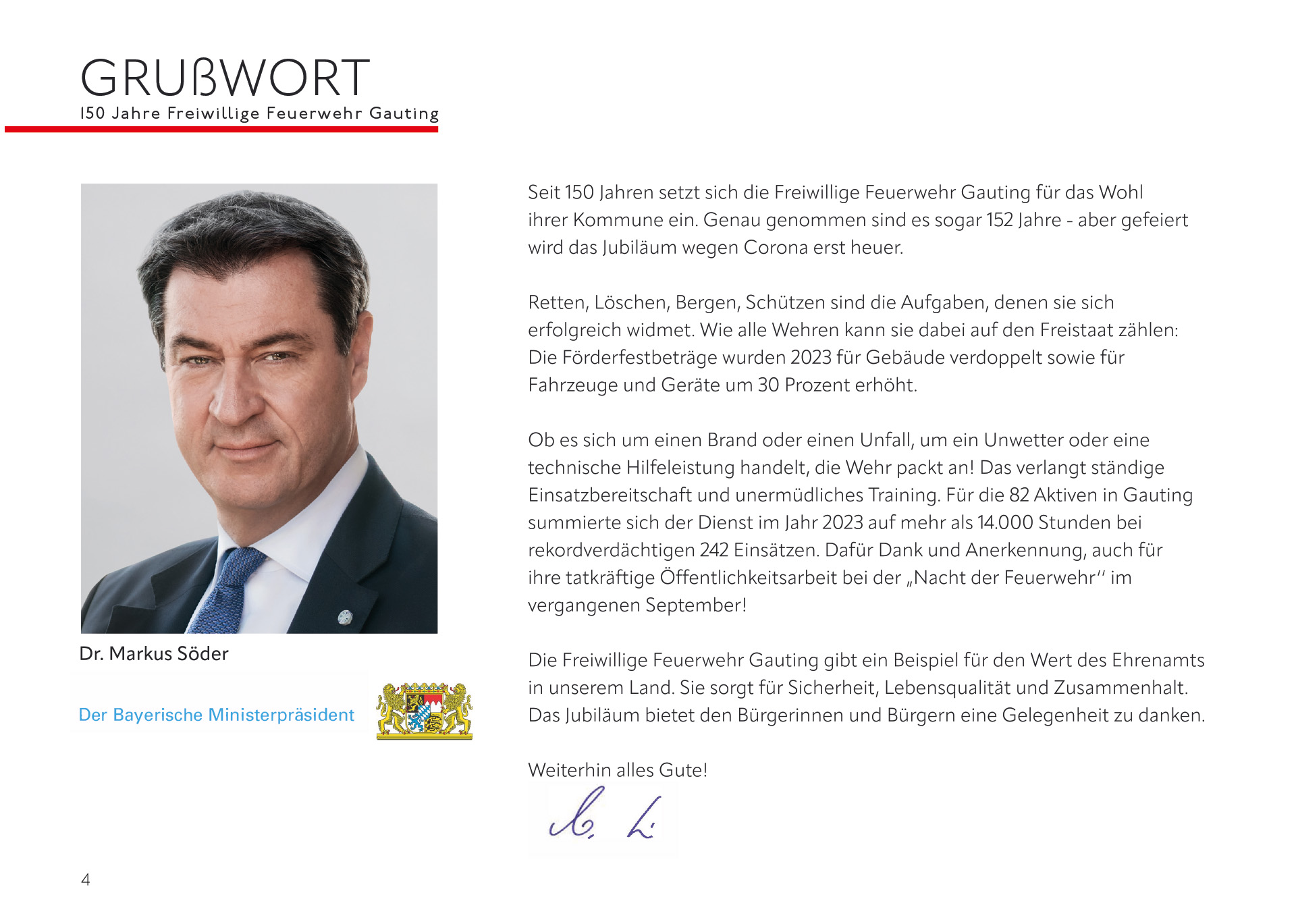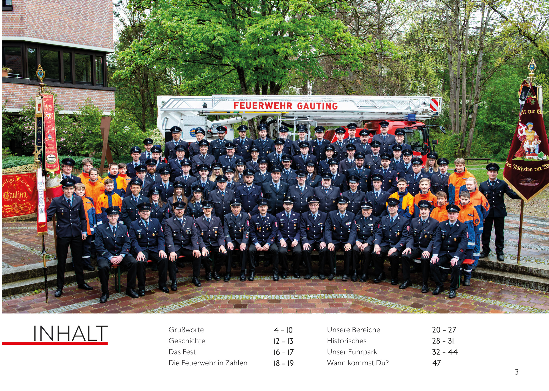Die Bilder und Texte, die Vorstellung des Festausschuss und Grußworte stellte die Freiwilllige Feuerwehr Gauting. Die Geschichte der Feuerwehr, die Zahlen und die verschiedenen Bereiche und der beeindruckende Fuhrpark sind ebenso in der Festschrift abgebildet. Unternehmen aus Gauting hatten die Möglichkeit Werbung zu platzieren.