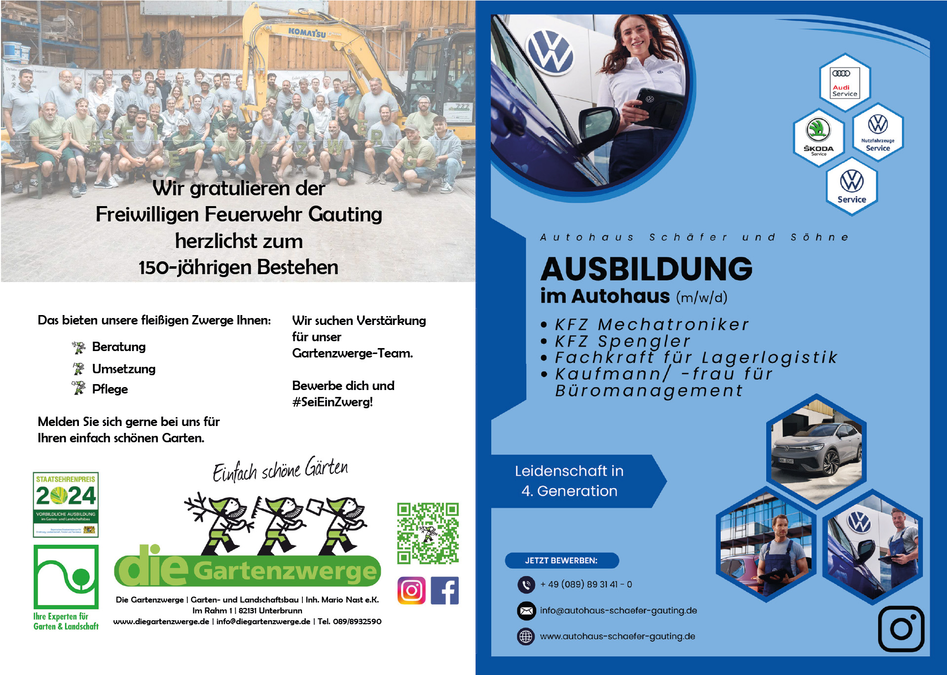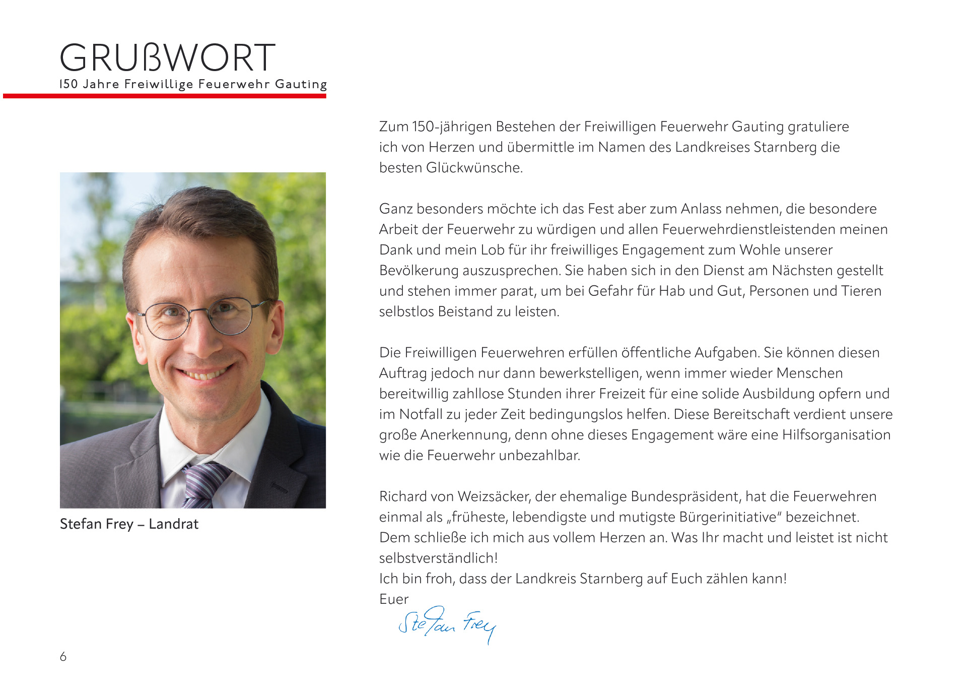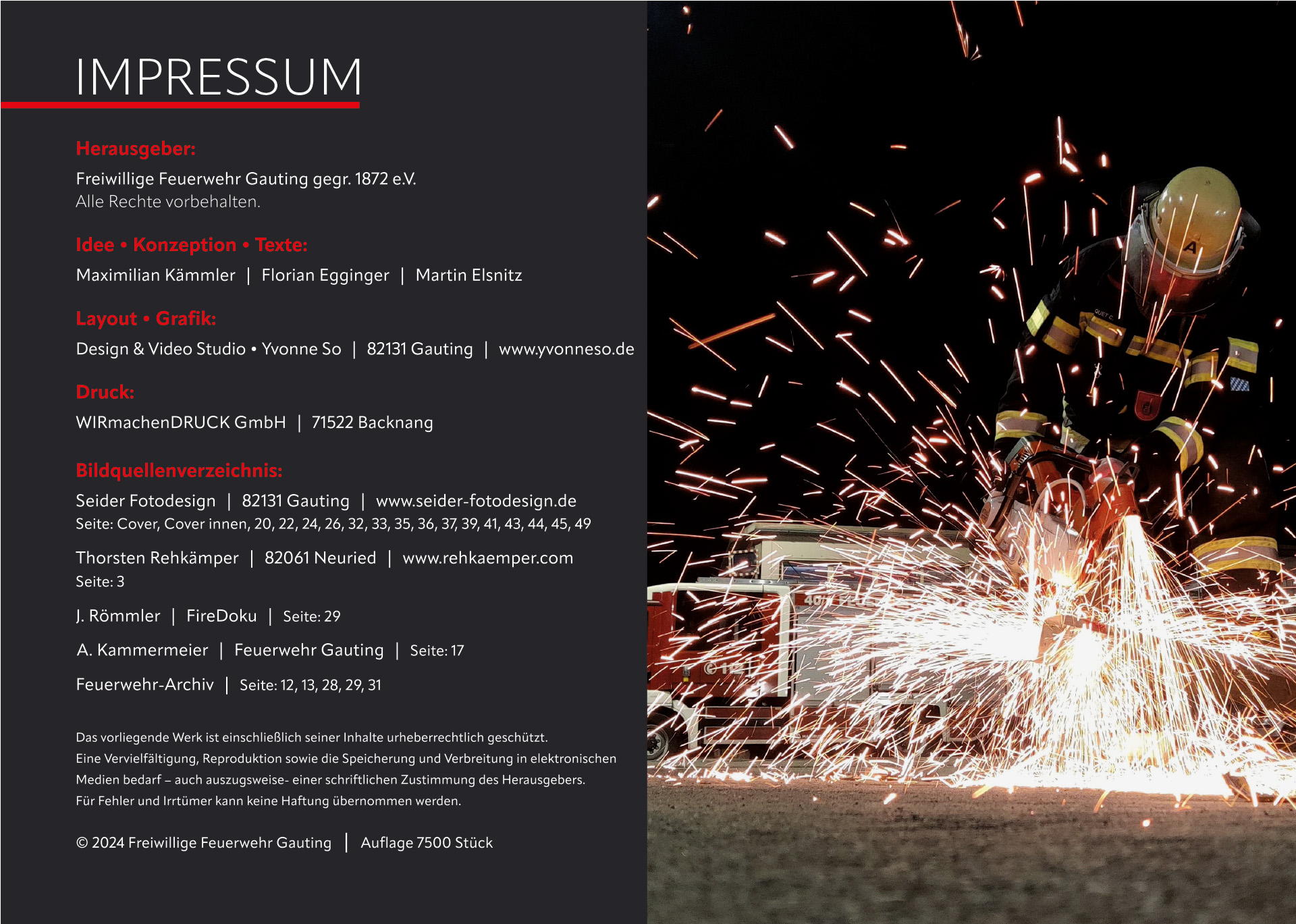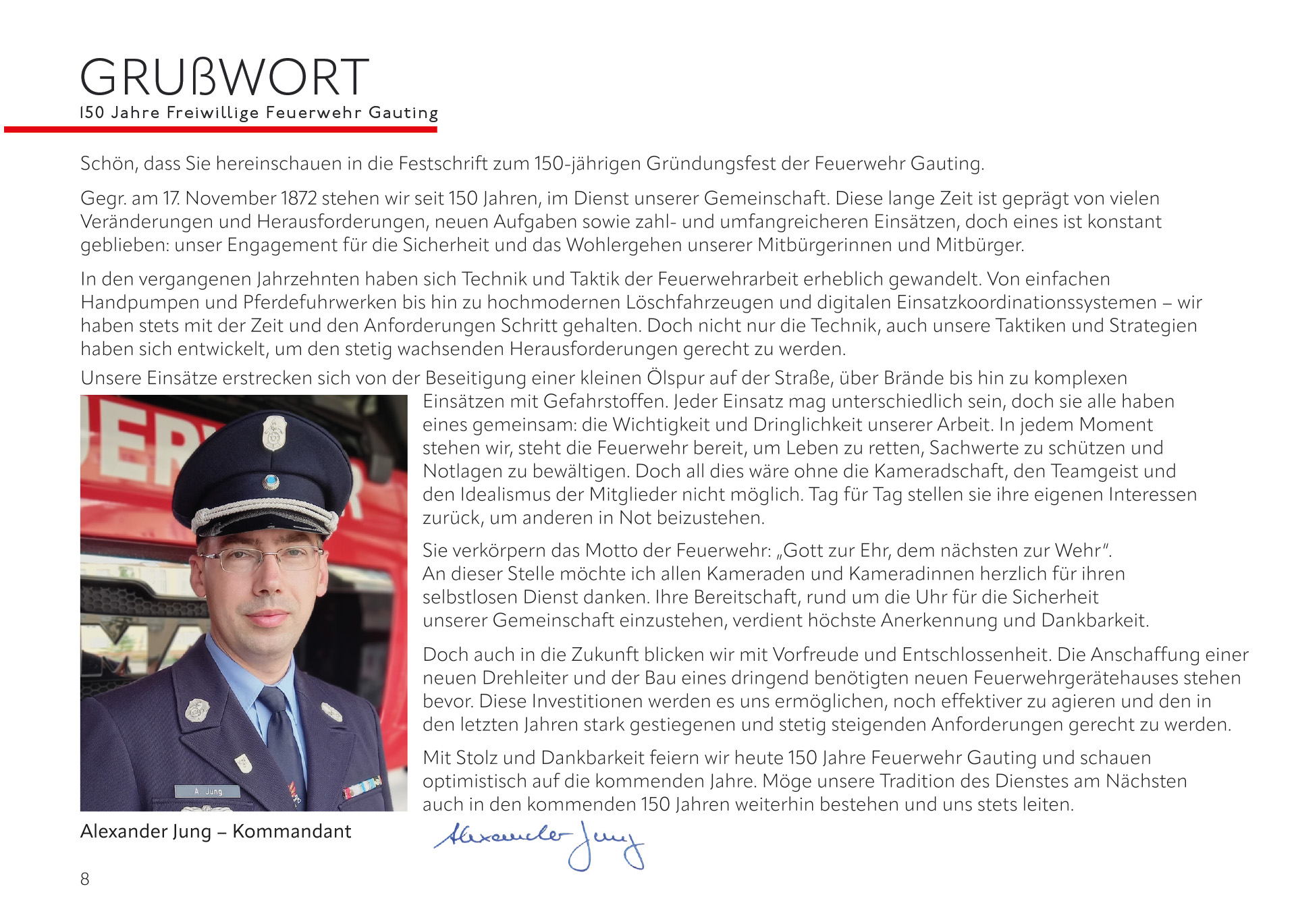 Die Bilder und Texte, die Vorstellung des Festausschuss und Grußworte stellte die Freiwilllige Feuerwehr Gauting. Die Geschichte der Feuerwehr, die Zahlen und die verschiedenen Bereiche und der beeindruckende Fuhrpark sind ebenso in der Festschrift abgebildet. Unternehmen aus Gauting hatten die Möglichkeit Werbung zu platzieren.