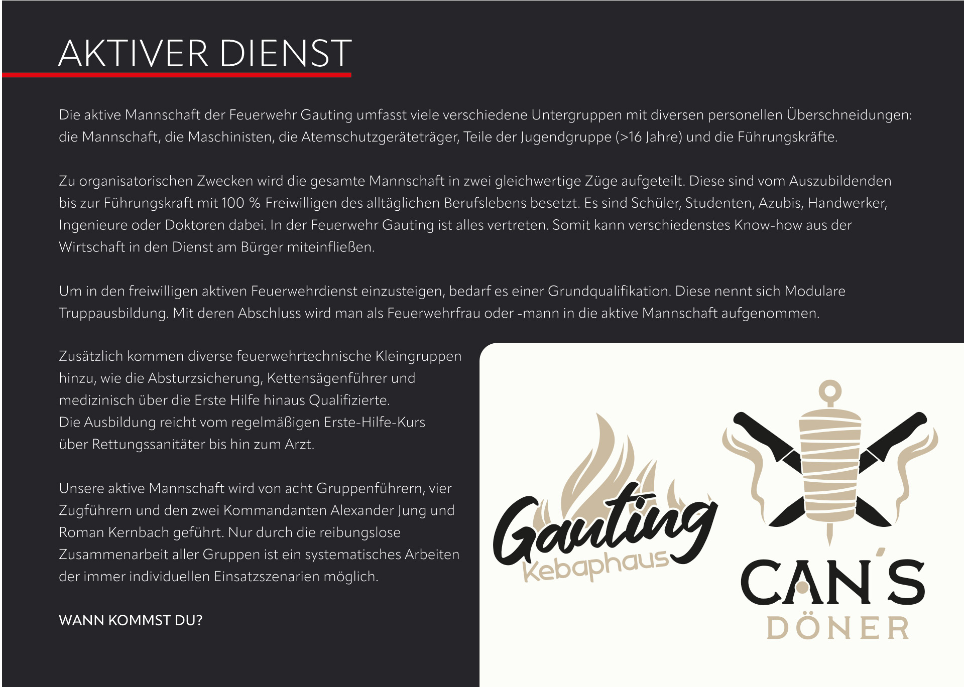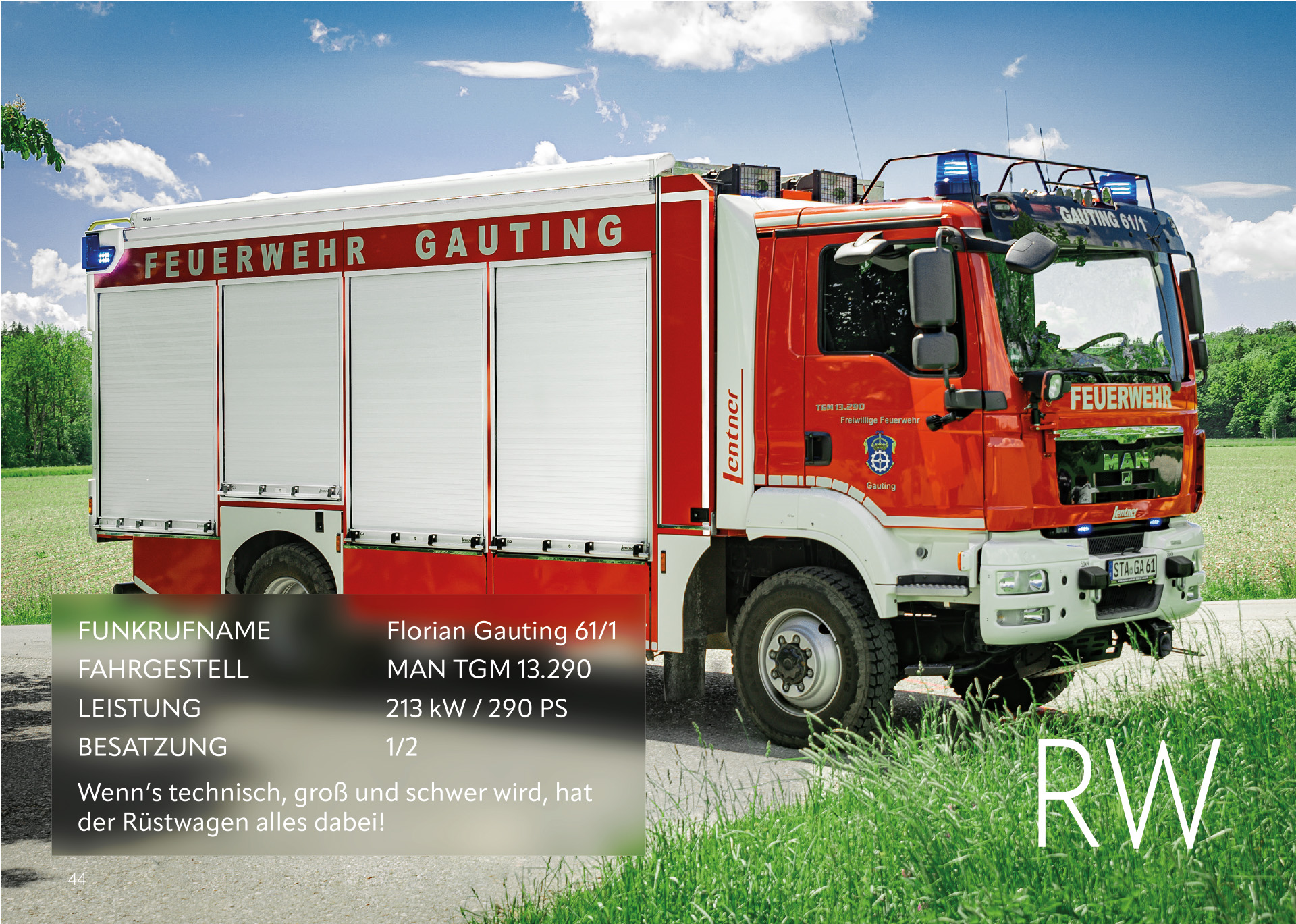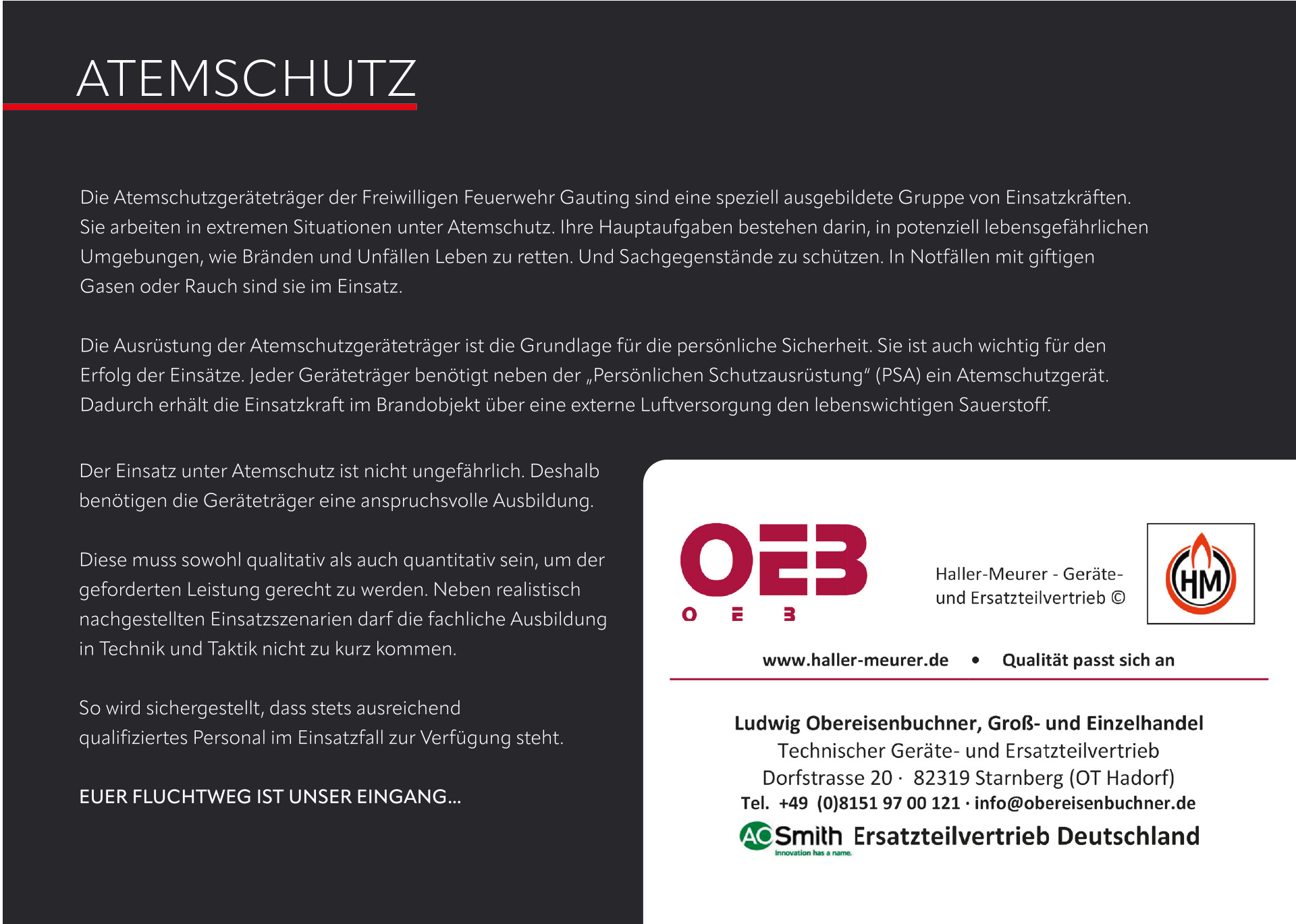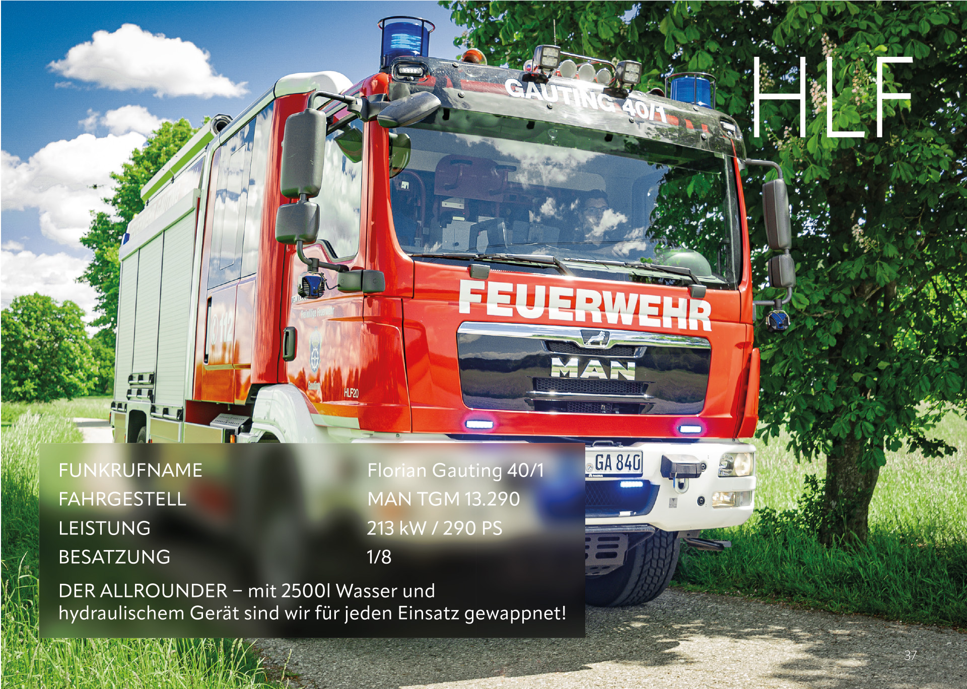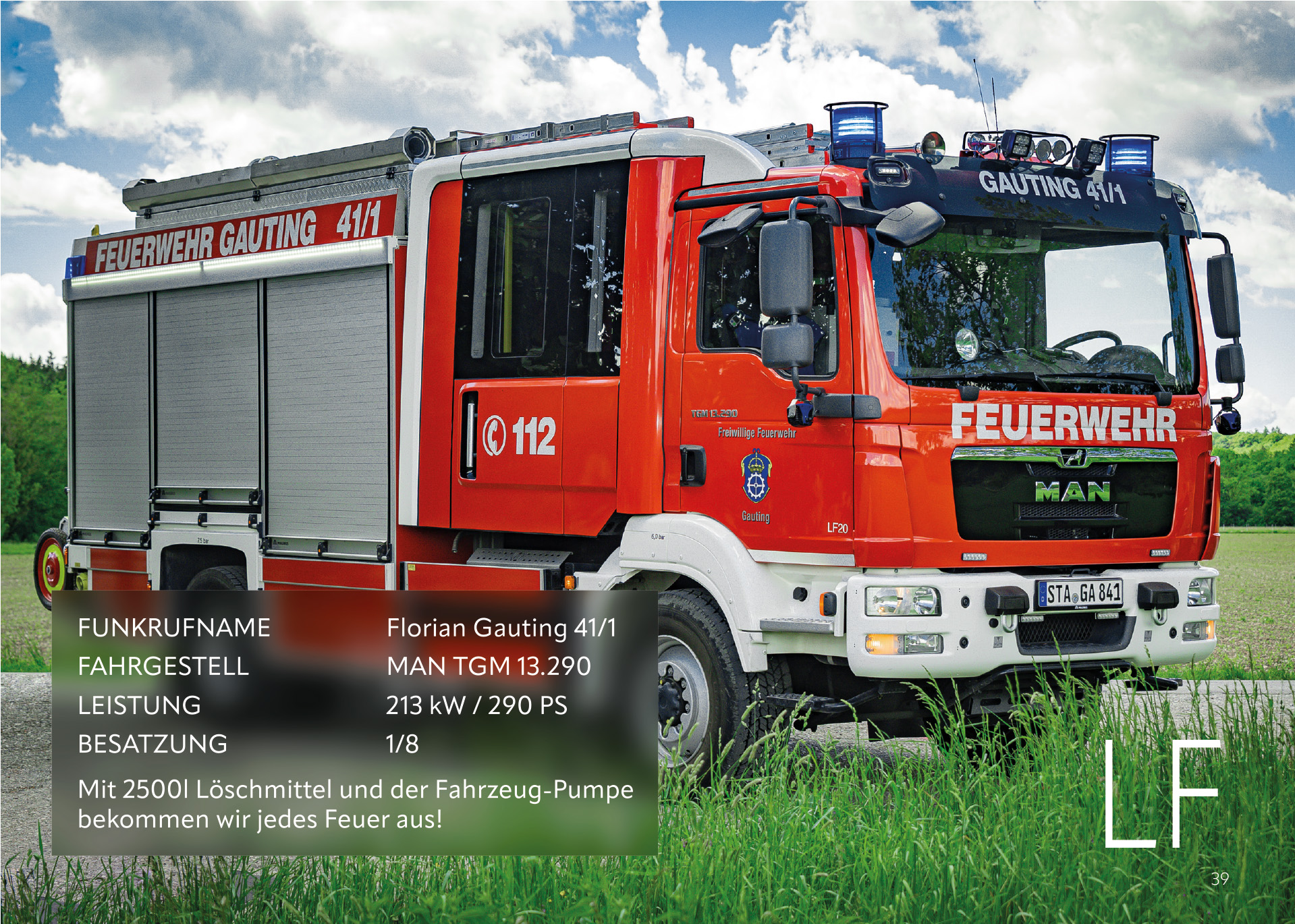 Die Bilder und Texte, die Vorstellung des Festausschuss und Grußworte stellte die Freiwilllige Feuerwehr Gauting. Die Geschichte der Feuerwehr, die Zahlen und die verschiedenen Bereiche und der beeindruckende Fuhrpark sind ebenso in der Festschrift abgebildet. Unternehmen aus Gauting hatten die Möglichkeit Werbung zu platzieren.
