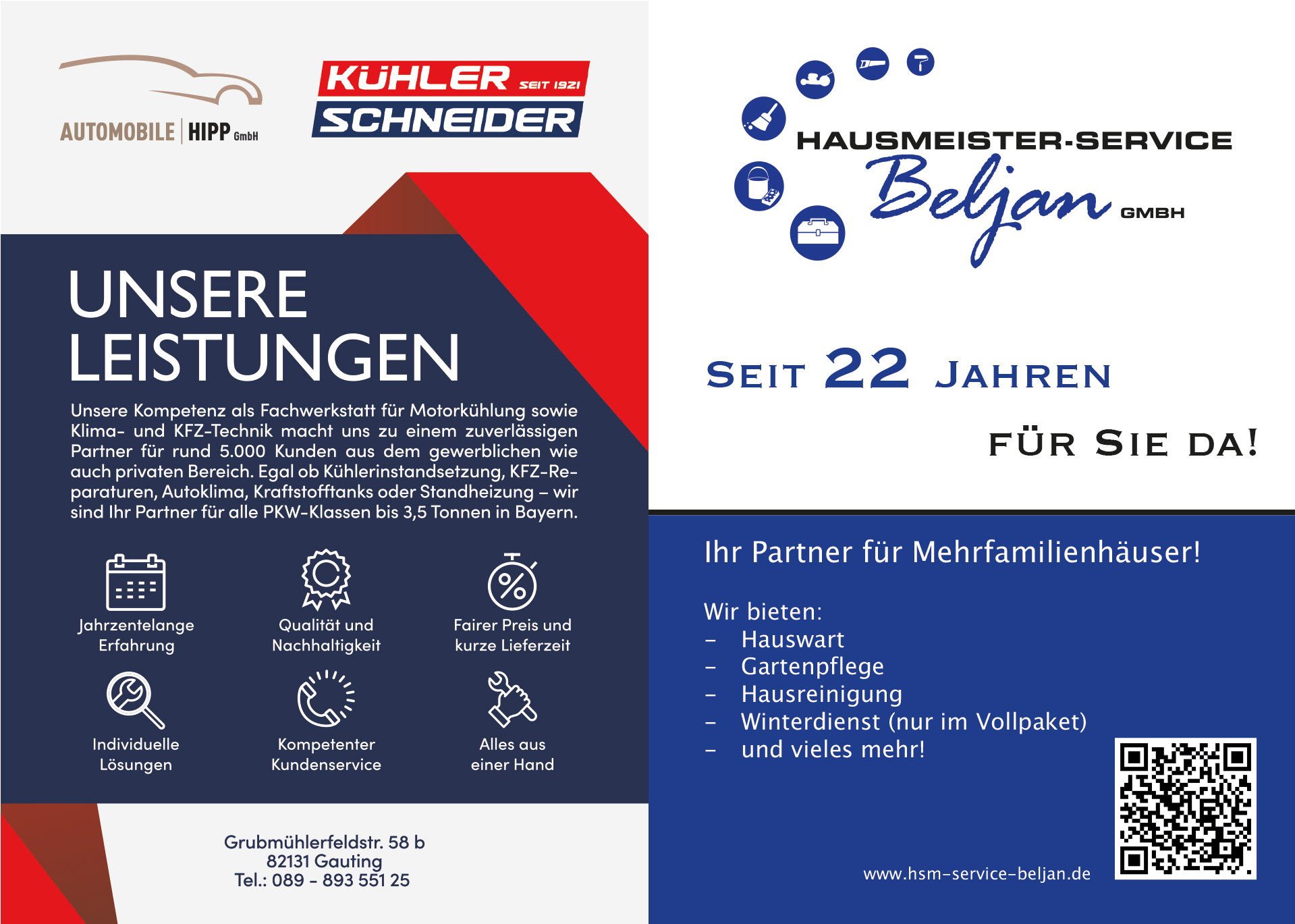 Metallbau Elsnitz • Sieber Brillen, Kontaktlinsen, Uhren, Schmuck • Backhaus Cramer - Holzofenbäckerei • Godo Apotheke • Wolfi's Getränkeladen • Sparkasse Gauting • Seider Fotodesign • Gauting Kebaphaus CANS Döner • Thomas Seiwald • Zehentbauer Glaserei • Bayernwerk • PIC OUT PRODUCTIONS Design & Video Studio • Zettl Versicherungsmakler • Klinikum Fünfseenland • Lutz Sanitär, Heitung, Klima • Die Gartenzwerge • Autohaus Schäfer und Söhne • Lenkzeit Fahrschule GMBH • Automobile HIPP GMBH • Hausmeister-Servive Beljan • Malerbetrieb Inverso