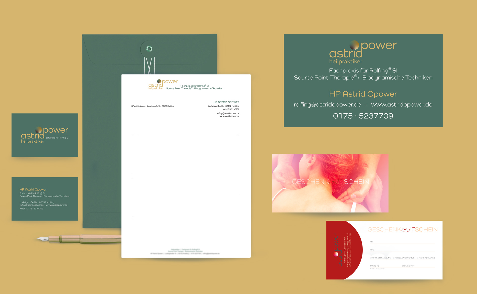 Die Geschäftsausstattung für Astrid Opower bestand aus einer doppelseitigen Visitenkarte, Briefpapier, Anamesebogen, Gutschein und Firmenschild.