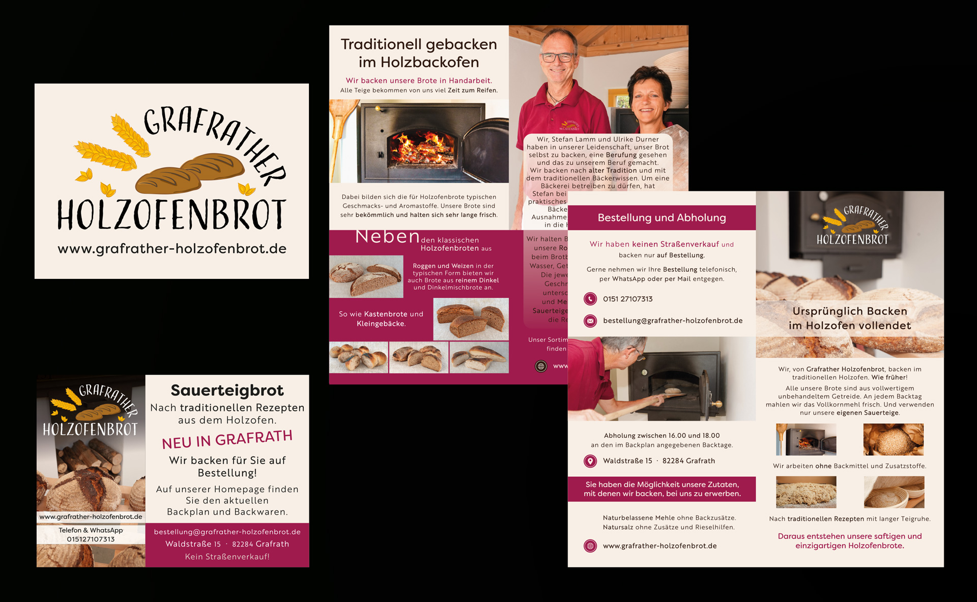 Die Geschäftsausstattung für die Bäckerei Grafrather Holzofenbrot bestand aus einem vierseitigen Einfalzflyer, Print-Werbeanzeige und Firmenschild.