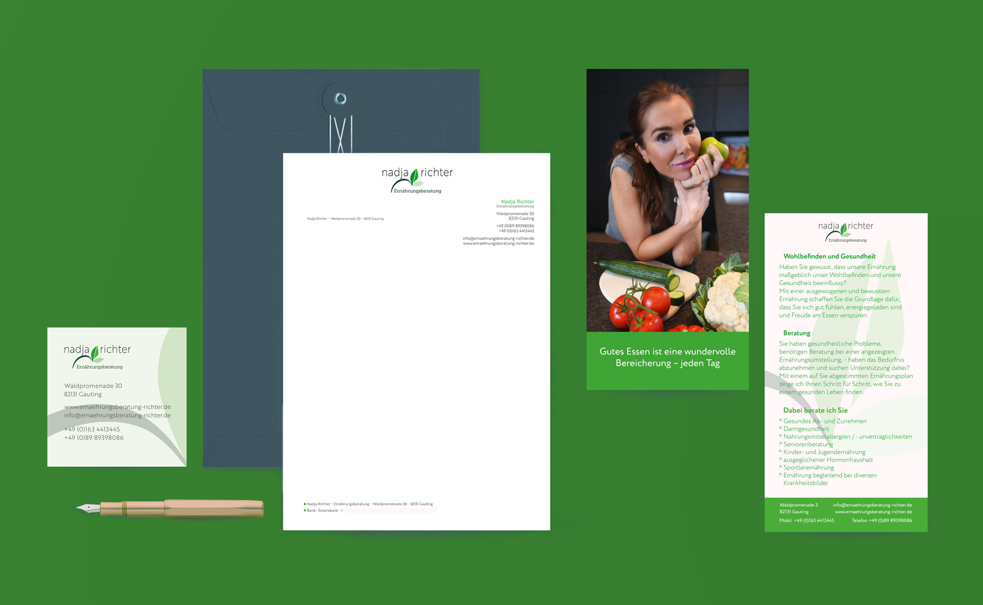 Die Geschäftsausstattung für Nadja Richter bestand aus einer quadratischen Visitenkarte, Briefpapier, Flyer, sowie Fotografie für Print und Web.